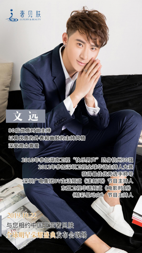 文远:80后优质时尚主持,以其优质的外表和幽默的主持风格深受观众喜爱,曾在2010年参加湖南卫视“快乐男声”跻身杭州50强,2012年参加深圳卫视全球华语主持人大赛获得最佳优秀选手称号。并且还是深圳广电集团DV生活频道《漾新闻》节目和东盟卫视华语频道《电影时刻》、《精彩星动向》节目的主持人。