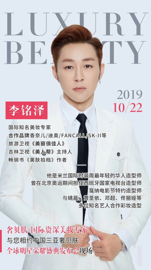 李铭泽:国际知名美妆专家;旅游卫生《美丽俏佳人》、吉林卫视《美人帮》主持人;畅销书《美肤拍档》作者,同时他是米兰国际时装周最年轻的华人造型师;曾在北京奥运期间担任西班牙国家电视台造型师;戛纳电影节特约造型师。他也与姚晨、黄圣依、邓超、佟丽娅等多位知名艺人合作过彩妆造型,更是香奈儿、希思黎、M·A·C、HR郝莲娜、阿玛尼、CPB、雅诗兰黛、兰芝、资生堂、欧莱雅等大牌资深美妆导师。