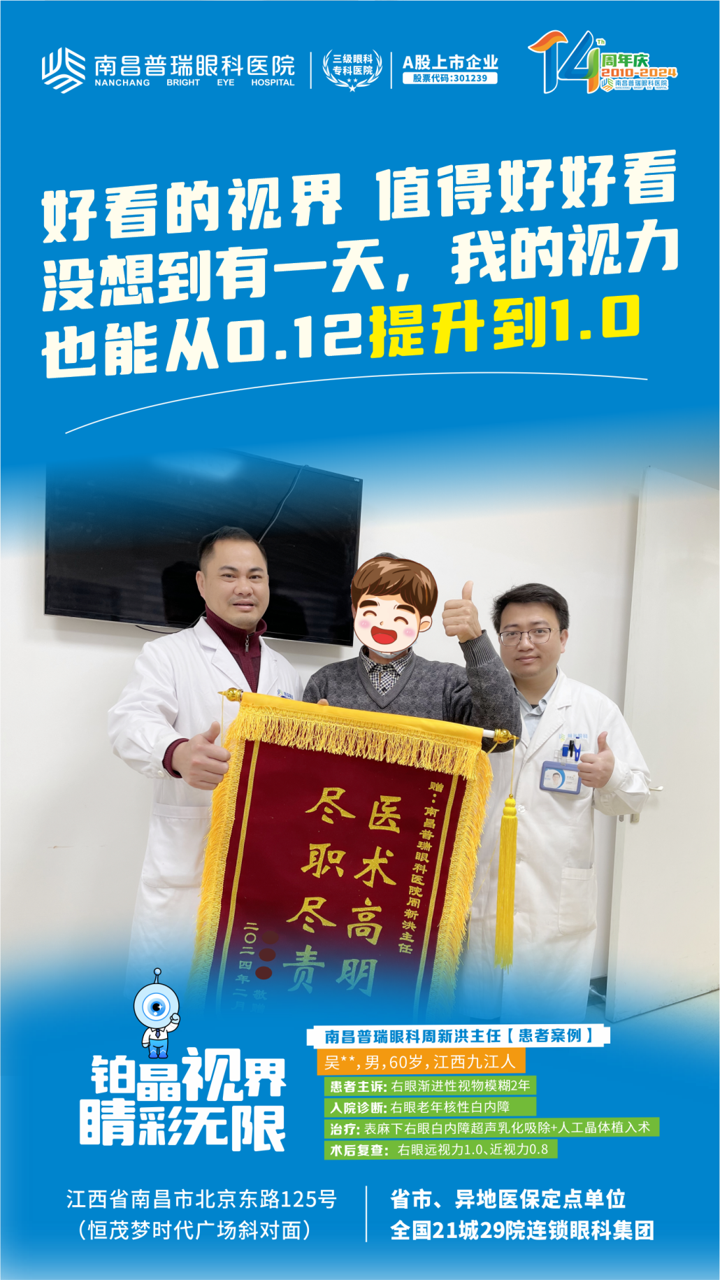 据了解,患者吴某今年刚满60岁,两年前右眼开始渐进性视物模糊。在生活中造成了很多不便,心理上也非常的焦虑。通过一番咨询,来到了南昌普瑞眼科医院,由白内障科室主治医生周新洪主任接诊,判断是老年核白内障,提出了可以安排手术进行治疗,经过沟通同意后,随后安排了入院。