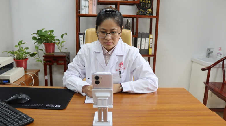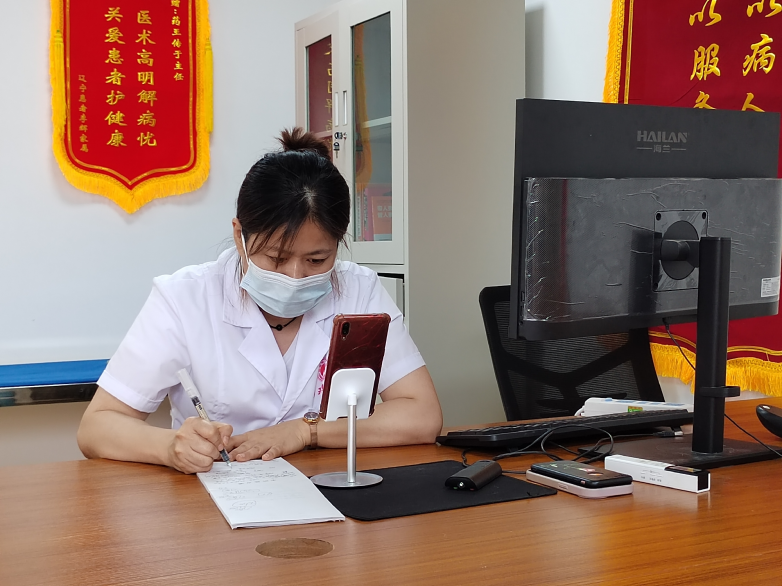 (于铜正在药王传中医院诊室中与患者远程问诊)