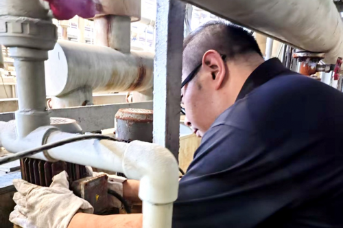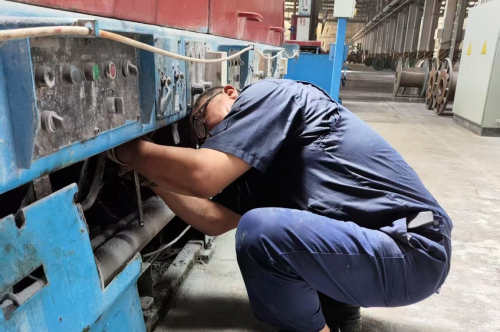 维修工李少峰巡检至粗拉2#机床时,发现底部有少量积水。他立刻打开机床防护挡板,一股热浪扑面而来,他却仿佛毫无察觉,取出垫布铺在地上,随即平躺下来,钻进狭窄的机床底部检查水管,细致排查后发现是管道喉箍松动导致滴漏,迅速动手紧固。当他侧身从机床下挪出时,浑身早已被汗水浸透,起身时一个踉跄,旁边的操作人员连忙扶住他。“没事吧?”“没事,机床下空间小、温度高,时间一长头有点昏,缓一缓就好。”话音刚落,另一台机床传来呼喊:“李师傅,我这钢丝拉拔的圈径有点问题,帮忙调整一下!”他笑着应了声“来了”,匆匆收拾好工具、拖干净现场积水后,便又快步赶了过去。