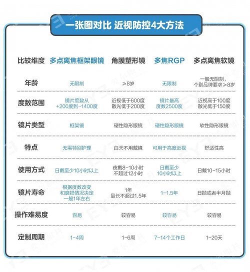 除了以上3种防控手段,还有多焦RGP等,接下来一张图带您对比这几种主要近视防控手段的特点: