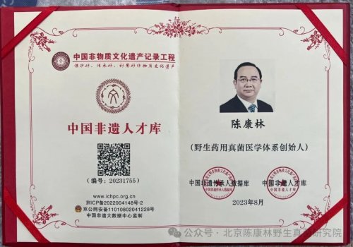 中国非遗人才库“野生药用真菌医学体系创始人”证书