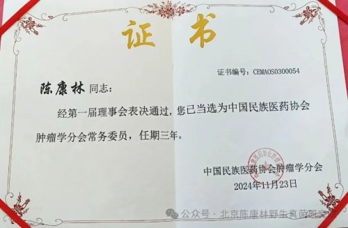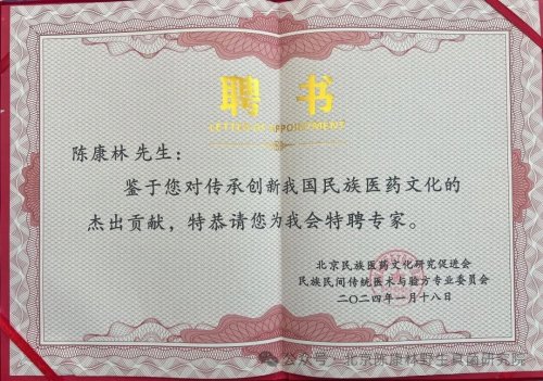 2024年底,陈康林教授向国家卫健委申报的“野生药用真菌自然医学体系研究应用”案例,经专家论证会论证通过,列入2024年(第二批)优秀创新健康技术案例征集宣传推广活动。国家卫健委人口文化发展中心和中国医药新闻信息协会中医药文化分会于2025年2月10日颁发宣传推广证书。2024年12月份,中国民族医药协会非药物疗法工作委员会理事会审核,聘请陈康林教授为专家委员。陈康林的所有技术在中国具有唯一性、创新性、独特性,引领了中国野生药用真菌中西医真正理论与实践融合的先例,开创了一个新的野生药用真菌自然医学体系的新时代。
