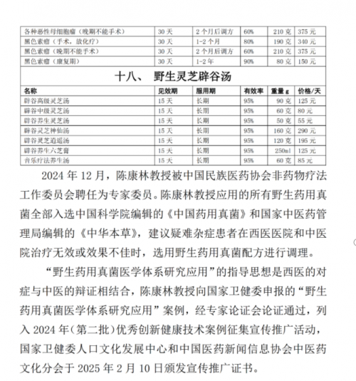 陈康林教授四十多年心血研究的“野生药用真菌医学体系研究应用”,该体系是国家卫健委于2024年向全国推广应用项目,这个体系的应用是利国利民的大好事,对今天西医院和中医院医治无效或效果不佳的疑难杂症患者,野生药用真菌医学给患者一个很大的希望。