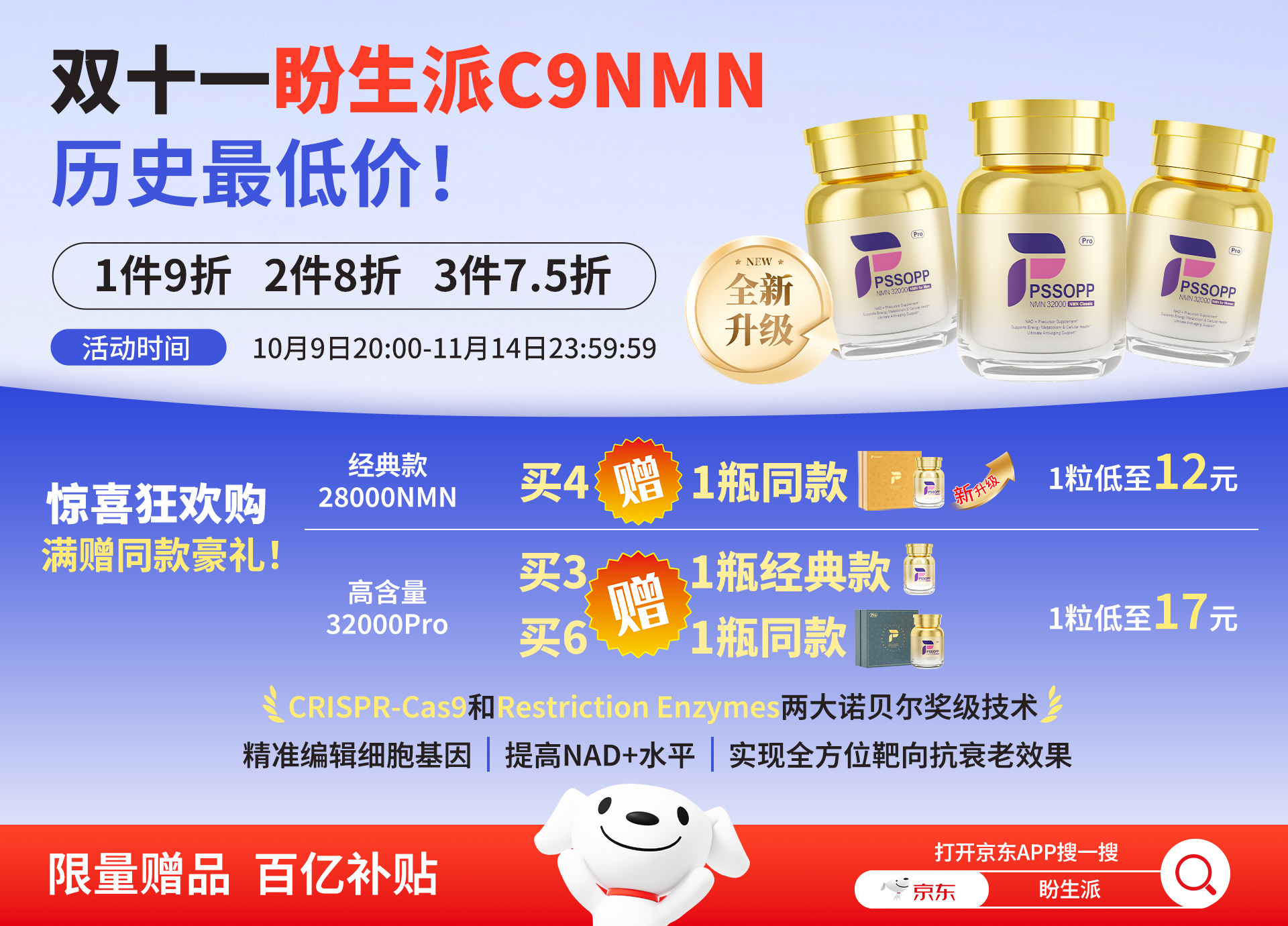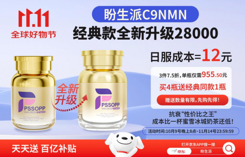 在这样热闹非凡的双十一氛围中,从3千亿新型口服抗衰保健品赛道脱颖而出、勇夺第一的盼生派C9NMN,带来了令人惊喜的狂欢优惠——3件7.5折,以1颗最低12元1瓶仅需955.5元的价格突破历史最低价,为消费者带来前所未有的购物体验。