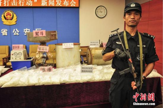 资料图:2015年,广东省公安厅展示的毒品涉案物品。相关行动共查处涉陆丰等毒品案件1334宗。中新社发 陈骥旻 摄