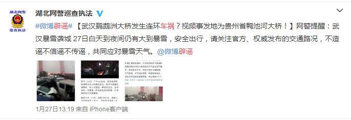 人民网北京2月1日电(孝金波 王亚静)近日,全国多地热传“当地某大桥路段发生多车相撞交通事故”,并配有事故现场视频。经查,网传视频内容为1月26日发生在贵州省贵黔高速鸭池河特大桥路段的多车追尾事故。湖北、西安、江苏、江西、浙江、安徽的各地警方和媒体发出辟谣声明。