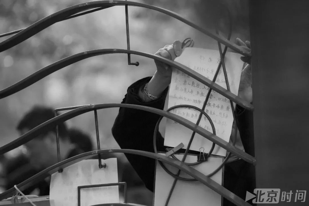 公园里到处都是人,路边摆满了雨伞,上面挂着相亲广告。这里就像个人才市场,家长为孩子写的相亲广告,感觉就像是一个个人,在被展览、被挑选,看好了就交换信息。