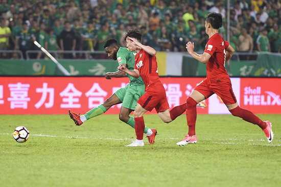 巴坎布(左)破门帮助北京中赫国安队在主场3:2战胜天津权健队。北京中赫国安队目前暂居中超积分榜首位。视觉中国供图