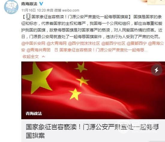 青海省委政法委员会官方@青海政法消息,国旗是国家的象征和标志,代表着国家的主权和尊严,我国每一个公民和组织,都应当尊重和爱护我国的国旗,故意侮辱国旗是对国家尊严的亵渎,对人民爱国热情的损害。