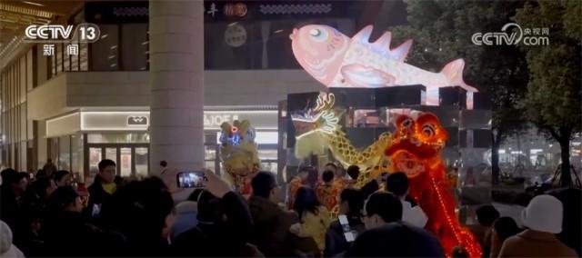 在上海虹口区的一处商圈里,一场热闹的舞龙舞狮活动拉开了春节活动的序幕,鱼灯巡游、年俗市集引来众多市民游客观看。