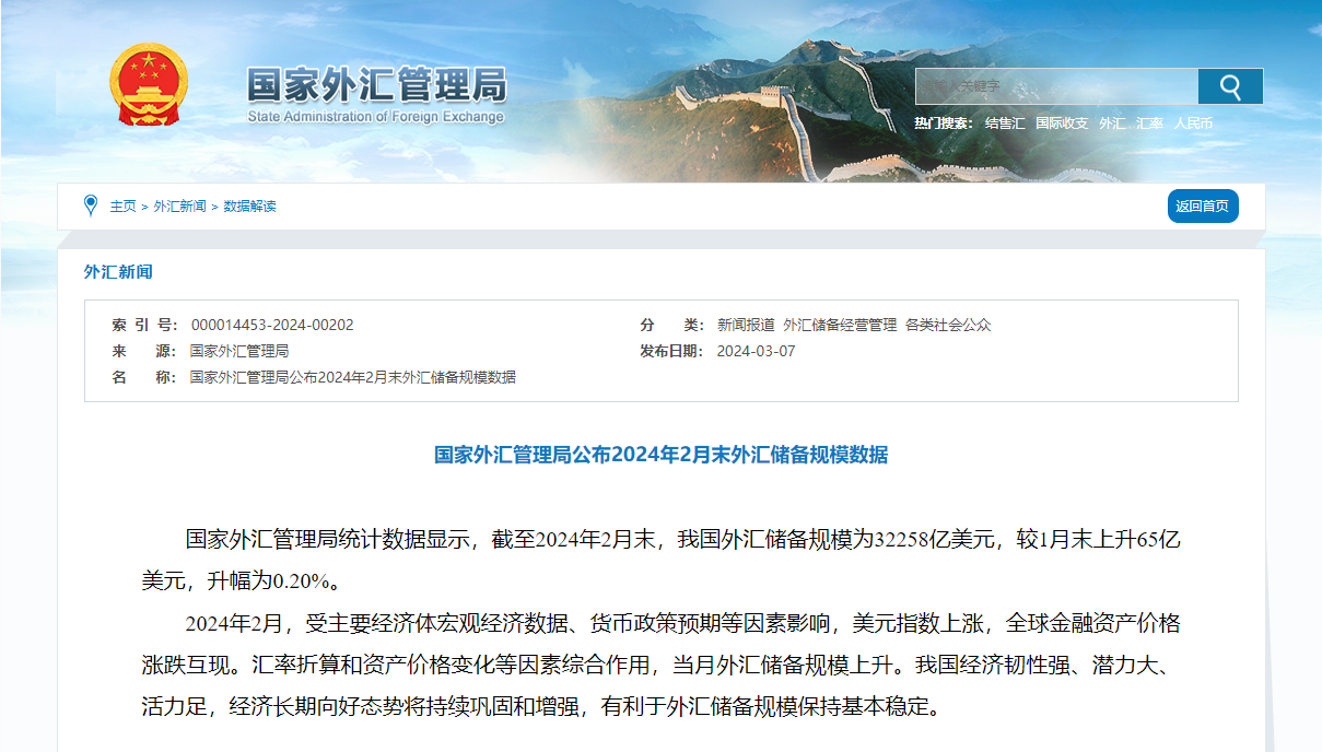 中国网3月8日讯 国家外汇管理局统计数据显示,截至2024年2月末,我国外汇储备规模为32258亿美元,较1月末上升65亿美元,升幅为0.20%。