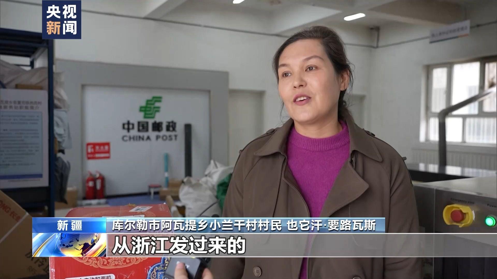 库尔勒市阿瓦提乡小兰干村村民 也它汗·要路瓦斯:我在网上买了一个和面机,从浙江发过来的。过去拿快递只能到乡里,现在直接到家门口,当天我就拿到手。