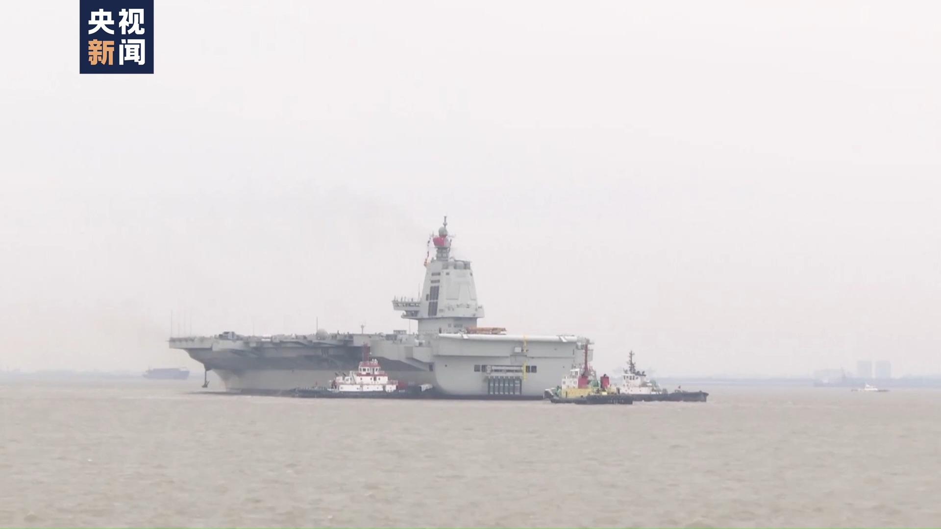 我国第三艘航空母舰福建舰在多艘拖船的牵引下,正在缓缓地驶离上海江南造船厂的码头,赴相关海域开展首次航行试验。