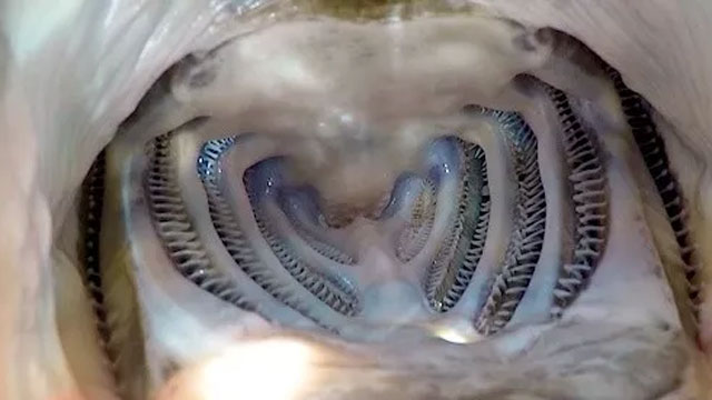 这条两米多长的大鱼足有几百斤沉,口中无牙,月牙形的巨口前长着奇特的触须。