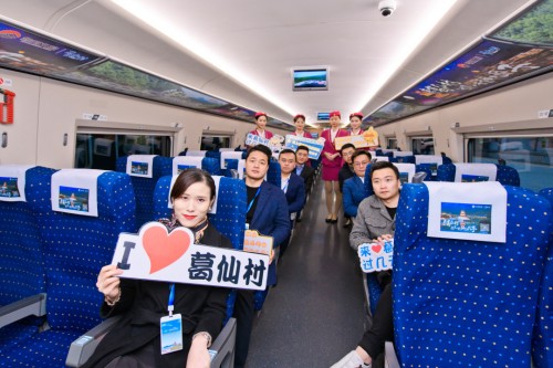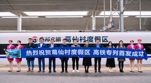本次专列将开启葛仙村度假区旅游品牌宣传的新篇章。鑫邦文旅事业部总经理陈思俊,葛仙村度假区总经理谢锦辉、营销总监马增、品牌总监姜晔,永达传媒华中大区总经理鄂庆、副总经理涂明锋等领导嘉宾莅临活动现场。