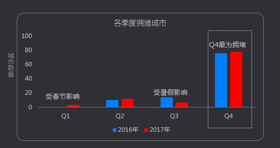 同比2016年,有51%的城市拥堵下降,27%的城市拥堵基本与去年持平,22%的城市拥堵出现上涨。