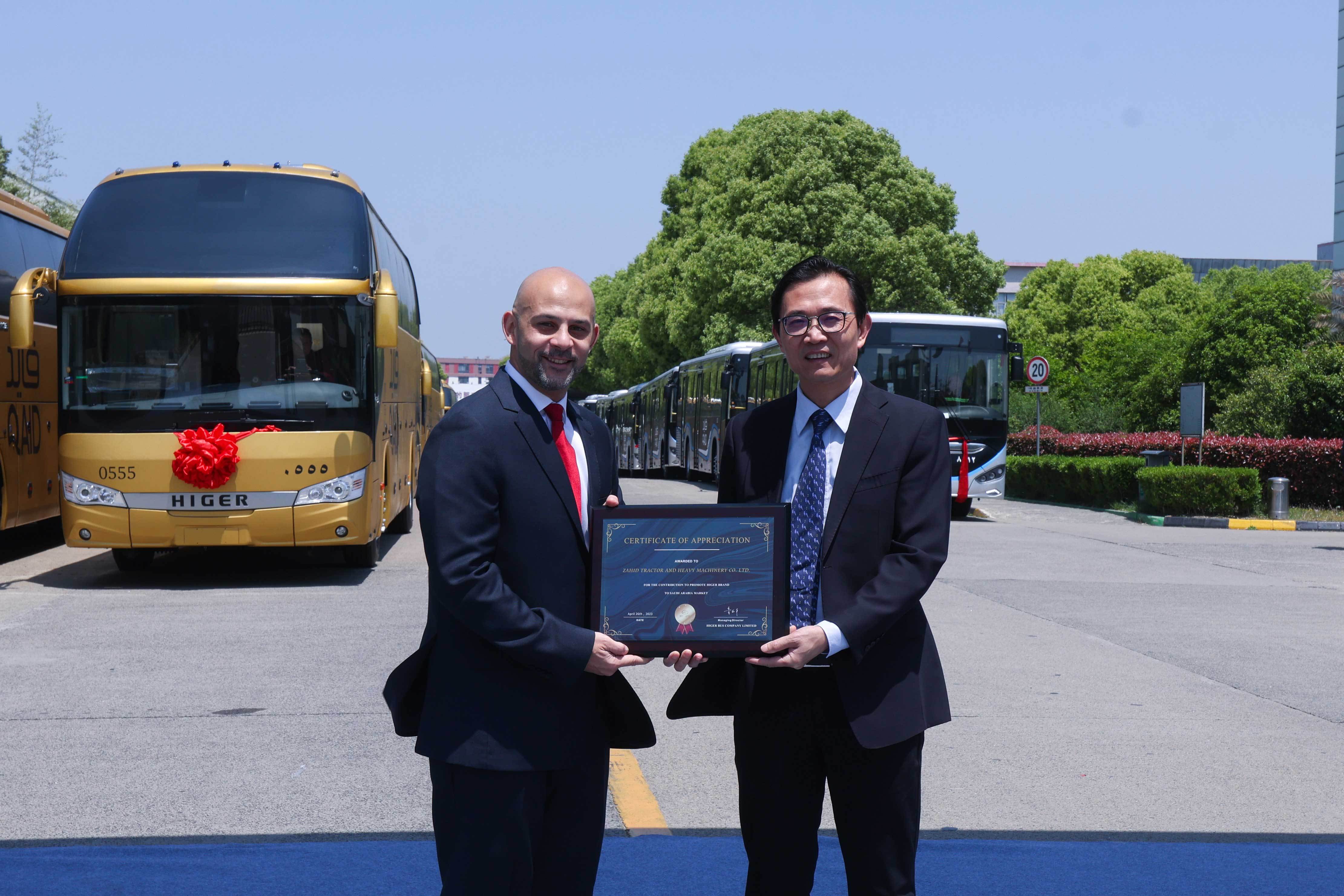 交车仪式上,苏州金龙总经理黄书平、副总经理邱远红分别向沙特经销商代表递交象征友谊与合作的金钥匙及牌匾。随着苏州金龙总经理黄书平宣布发车,780辆苏州金龙海格客车正式启程,发往沙特。