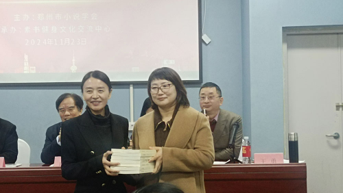 获奖者代表渔溪、赵洁上台发表获奖感言,市小说学会副秘书长曹海霞代表学会向承办方素书健身文化交流中心捐赠了图书。素书健身文化交流中心总经理王卿表示了感谢,并为与会者介绍了素书的创建初衷与建造情况。