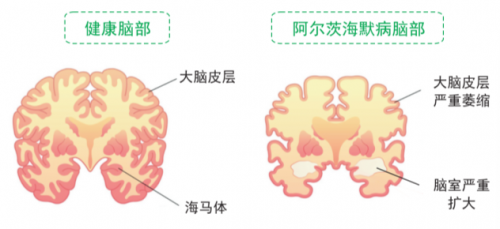 简单来说,患者的大脑会出现β-淀粉样蛋白异常沉积形成的“斑块”,和Tau蛋白过度磷酸化形成的“神经纤维缠结”。这些病变会导致大脑神经元大量死亡,大脑萎缩,功能逐渐丧失。