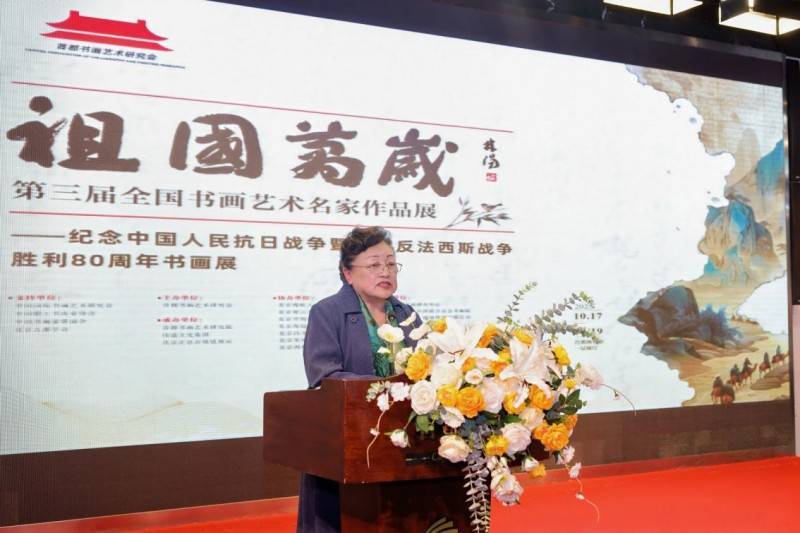 在热烈的掌声中,首都书画艺术研究会会长杨建利首先登台发表开幕辞。她表示:“展览的成功举办离不开全国艺术界同仁的同心同德与倾情付出,这份对书画艺术的赤诚坚守和对家国情怀的深切眷恋,让这场致敬历史、礼赞时代的文化盛事得以呈现,为传承红色基因,弘扬中华优秀传统文化搭建了坚实平台。”