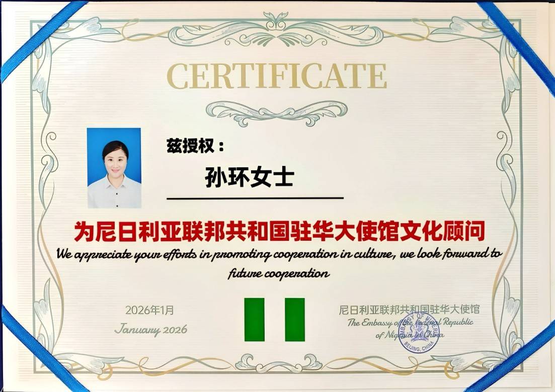 孙环的视野与贡献并未局限于校园。凭借对文化交流的热忱与推动,她荣获了“尼日利亚驻华大使馆文化顾问”这一重要身份。这契合了中非人文交流日益深入的时代背景,从青年艺术家合作计划到共建文化交流中心,中非友好的桥梁正不断加固。