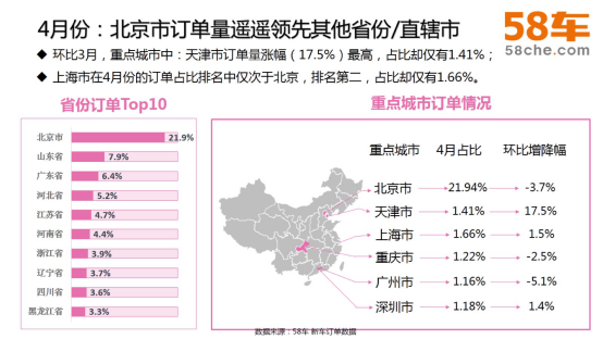 北京市的订单一直遥遥领先于其他省份城市,4月依然是全国省份/城市订单霸主。省份订单中,山东和广东分列二、三位。从城市订单的环比情况来看,上海市以1.66%的订单占比紧随北京之后,天津进步飞速,环比3月增长了17.5%,位列第三。重庆和广州有不同程度的环比降幅。4月北、上、广、深齐聚榜单,展现了一线城市的强大购买力。