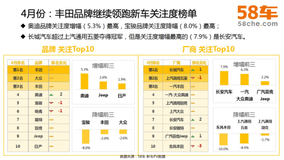 作为品牌关注的常客,相信大家对丰田、大众、本田都不陌生,4月它们依旧在榜首。奥迪品牌排名上升2位,增幅为5.3%,降幅最高的品牌为宝骏,降幅为8%。虽然在榜首,但本田和大众也略有降幅。长城汽车本月表现亮眼,夺得厂商关注度第一名。