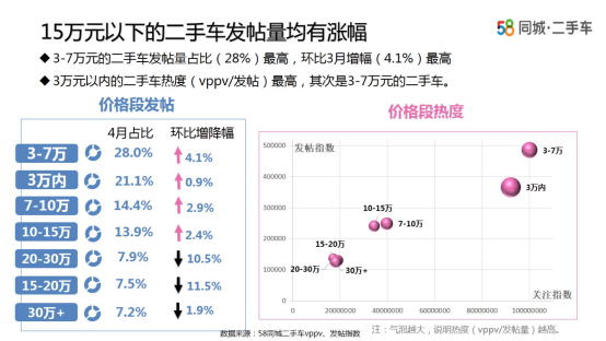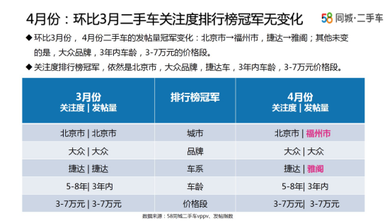 4月份的二手车市场最大的变化为:发帖量冠军城市由北京变为福州,车系由捷达变为雅阁。3年内车龄、3-7万元车型依然是消费者最为关注的重点。