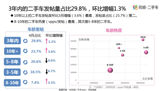 3年内二手车发帖量占比29.8%,环比增幅1.3%,10年以上二手车环比增幅3.6%,8-10年的发帖增幅和热度双高。4月与以往低龄车高关注的情况有所不同,似乎有中高龄车回暖迹象。