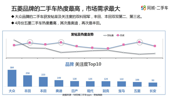 二手车品牌中,大众、丰田、本田关注度最高,大众还是4月的发帖和关注度冠军,五菱和长安作为国产自主品牌,位列第九和第十。热度最高的品牌分别为五菱、奥迪、丰田。