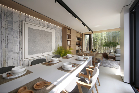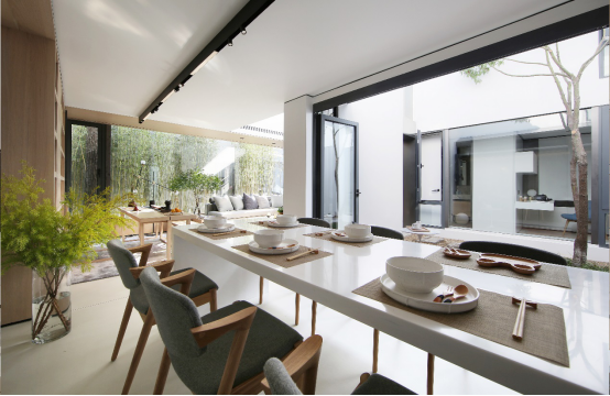 开放式的厨房,增加了西厨料理台,圆了女主人拥有大厨房的梦想。巧妙的是,在将餐厅推拉门的打开之后,餐厅便与天井融为一体,不仅无形中放大了空间,也为委托人一家带来了一份自然的惬意。