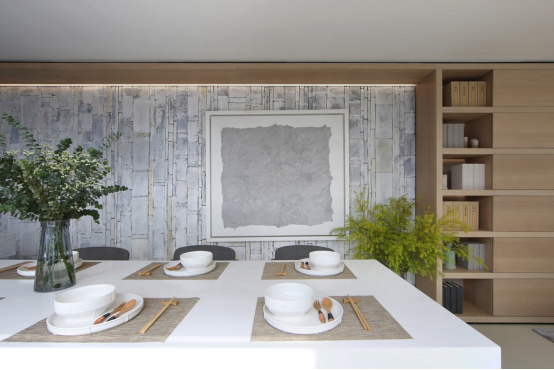 主餐桌旁,设计师更是特意将祖宅上拆下来的老青砖拼接成了餐厅背景墙,保留了老宅特有的味道。