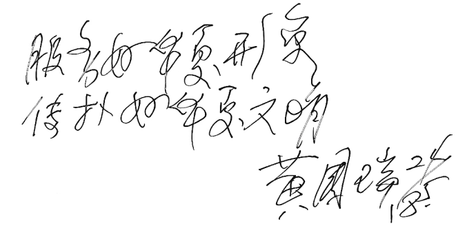 黄国瑞中将非常关心华夏形象传媒未来发展和规划,给予了很多中肯的建议,他希望华夏形象传媒不忘初心,不负使命,做好文化传媒事业,为中国文化建设添砖加瓦。黄国瑞中将题字:“服务好华夏形象,传播好华夏文明”,以表达对华夏形象传媒的期望,华夏形象传媒杨丽萍副总裁等全程陪同。