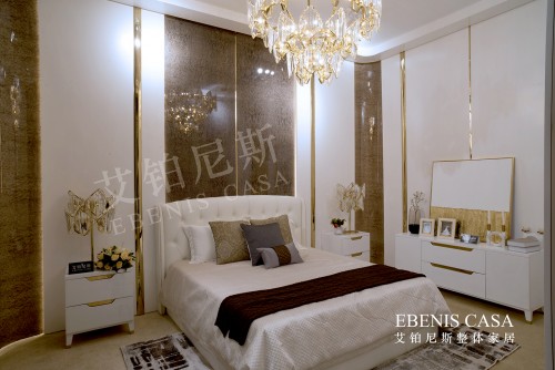 奢华不一定要金碧辉煌,白色系也能打造出现代奢华家居。昂贵的山香果树瘤木皮在清漆的效果下舒展着美丽的纹理,弧形的墙板展现出艾铂尼斯精湛的工艺,镀24K纯金的金属条以及椭圆形的立柱,配合灯光打造出影影绰绰的光影效果。这是艾铂尼斯的轻奢风格产品。