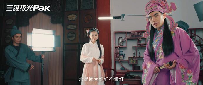 塑造矛盾。这个矛盾不在于秋香与如花之间,而是不同灯光下的秋香。故事开始之初,三雄极光埋下伏笔,让秋香置身于阴暗不定的光环境下,以致于祝枝山等才子误以为是女鬼上身。转折点就在于一束好光的投射,貌若天仙的秋香女神就立即上线了。然而故事并没有就此结束,唐伯虎转身变成灯光设计师,通过4个不同照度、亮度、显色性、投光方向的对比图,直观地为观众展示了“灯光如何影响秋香的颜值”。就这样,三雄极光为普通大众完美地上了一节灯光知识大学堂,简单、易懂又实用。
