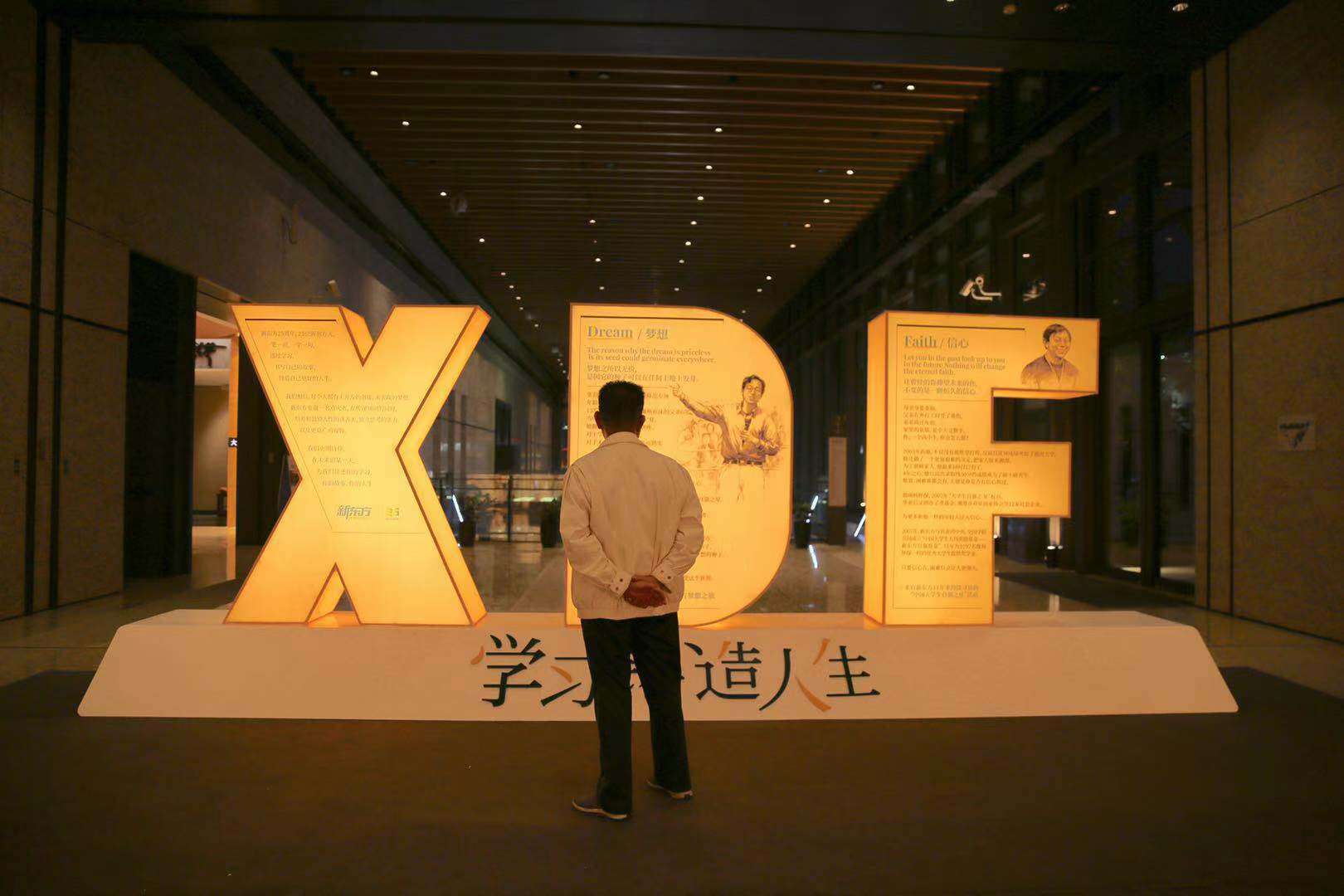 这个“学习铸造人生”装置艺术展是新东方联合著名艺术家解勇推出的,可谓“新东方”的基因十足。除了主装置采用英文字母的创作元素外,还有26个英文字母艺术装置环绕周围。除字母X代表着“未知的你”,新东方联合艺术家用25个单词串起25位新东方相关人物的故事。