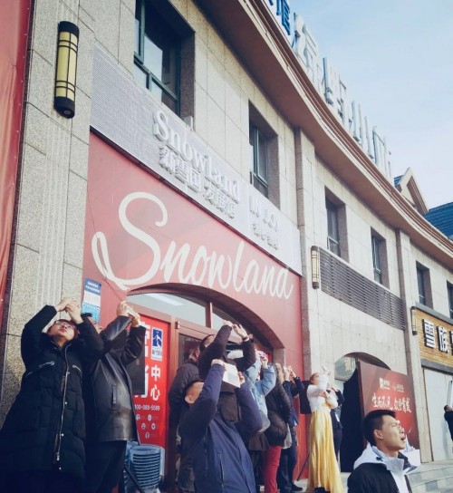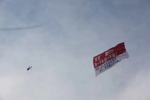 本次最大的亮点莫过于新雪国直升机拉着1000平米大旗,跨越各个雪场上空,为诚铂酒店开盘助阵!这也是国内首次引用直升飞机开盘造势。