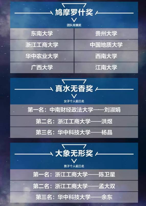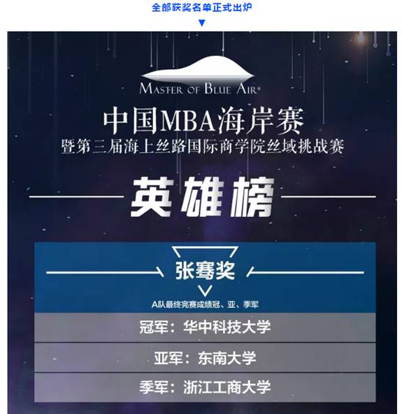 经过两天的激烈比拼,最终华中科技大学获得团体冠军,东南大学获得团体亚军,浙江工商大学A1队获得团体季军。汕头市体育局副局长黄腾耀,南澳县体育局副局长吴云岗,汕头市体育局群体科科长王勃,汕头市体育局法规科负责人吴斌,汕头市体育局群体科副科长王哲,江南大学武戈院长,东南大学经济管理学院周勤教授、姚建平主任,山西财经大学阎淑青副书记,华中科技大学彭静主任,西南财经大学郑红霞主任,贵州大学李雨峰主任,南京理工大学杨璐副主任,西北工业大学李怡老师,浙江工商大学王辉老师,国际商学院丝域挑战赛、中国MBA海岸赛创始人兼赛事主席朱小黑先生等为获奖院校及个人颁奖。