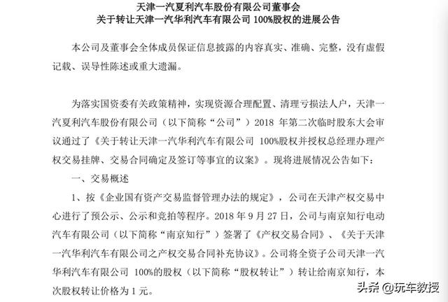 2018年9月,一汽夏利以1元的象征性价格,将旗下全资子公司一汽华利100%的股权转让给拜腾汽车的母公司——南京知行电动汽车有限公司,拜腾汽车也因此获得了汽车生产准入资质。