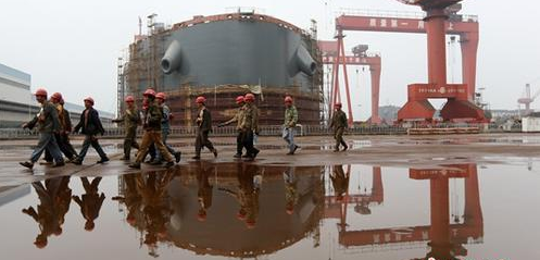 图为一家造船厂内,工人从正在建造的船前经过。(资料图片)中新社记者 泱波 摄