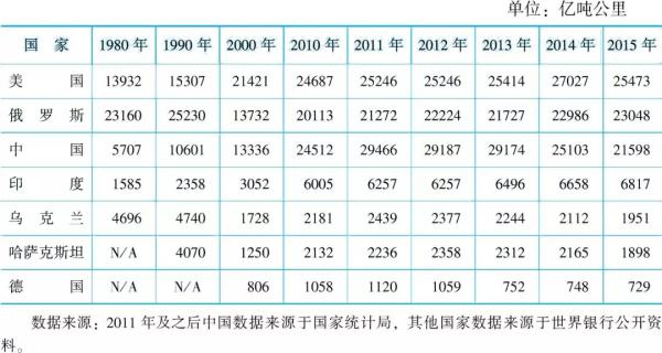 货运周转量方面,美国、中国与俄罗斯保持世界前三。中国自2012年后逐渐下降,2015年居世界第三。美国2015年也比2014年下降,以25473亿吨公里居世界之首。从图表中可以看出,苏联国家货运周转量自1980年开始后明显萎缩(见表5、图3)。