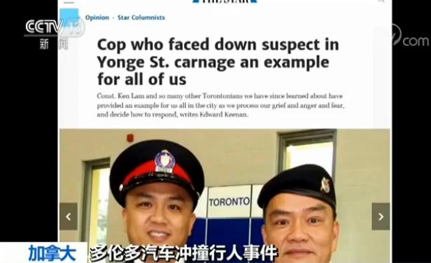 本月23日,一辆白色厢式货车在多伦多市北约克区的人行道上冲撞行人,导致10死14伤。从接到第一个报警电话到抓捕嫌疑人,多伦多警方用了7分钟。在这一过程中,华裔警员林志杰在受到威胁的情况下,未开一枪,仅用37秒就制服并逮捕了犯罪嫌疑人米纳西安。事后,加拿大《国家邮报》、《多伦多星报》等多家媒体就此进行报道,赞扬林志杰不贸然开枪、生擒嫌疑人的处置方法。对此,《纽约时报》、《今日美国》等美国媒体也进行了关注。