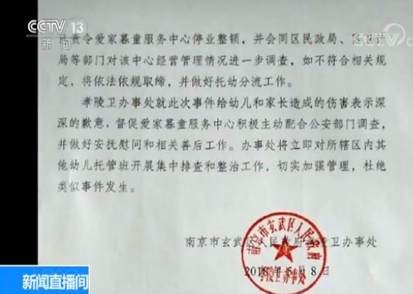 5月8日,该服务中心所在的南京市玄武区孝陵卫办事处也通报了对此事件的处理意见,并将会同当地民政、卫计等部门对该中心经营管理情况进一步调查,如不符合相关规定,将依法取缔,并做好托幼分流工作。