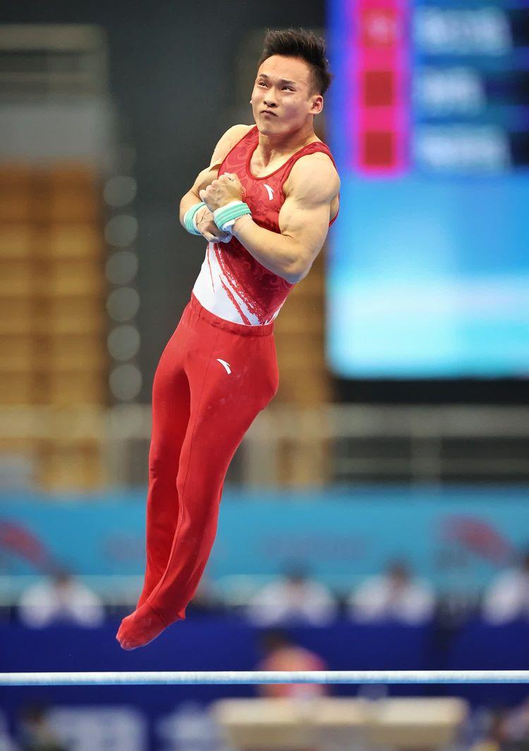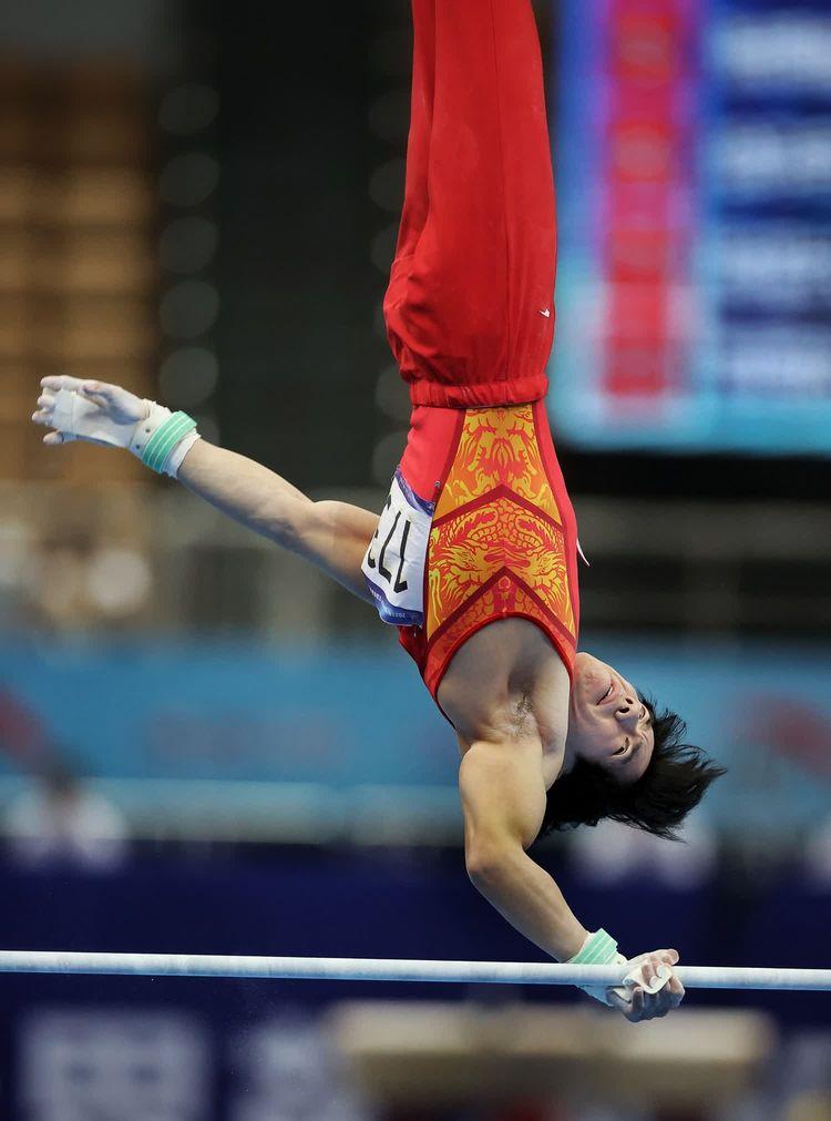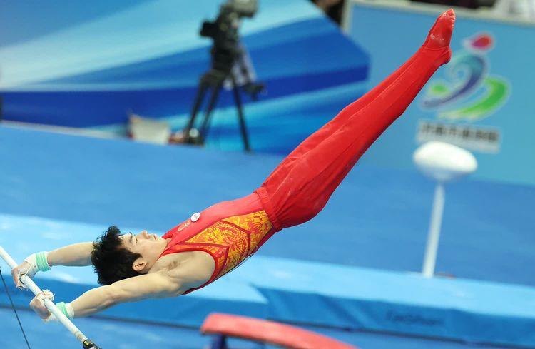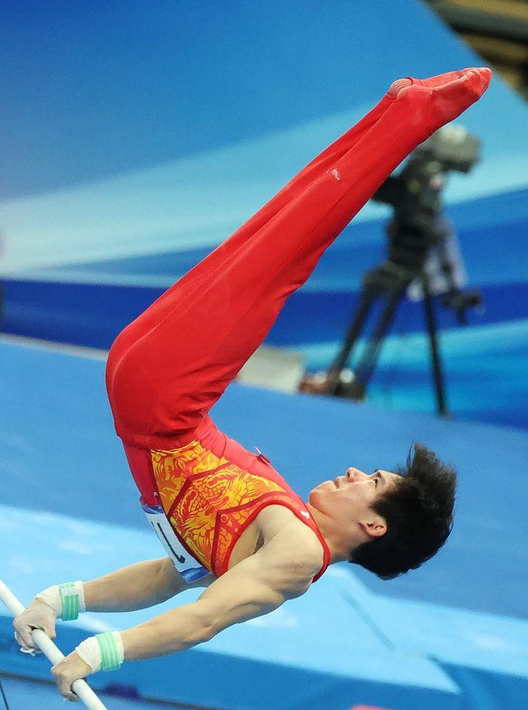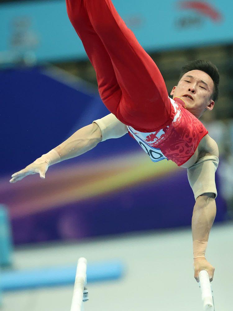 在今天的决赛中,首轮自由体操比赛张博恒就以出色的发挥得到了全场最高的14.900分。后面的比赛中他更是一骑绝尘,最终以鞍马14.000分、吊环14.600分、跳马14.800分、双杠15.150分、单杠14.700分的成绩稳居第一。其中,自由体操、双杠与单杠项目均是全场最高分,最终如愿收获了男子个人全能冠军。(图一、三、四为张博恒在争夺个人全能冠军)