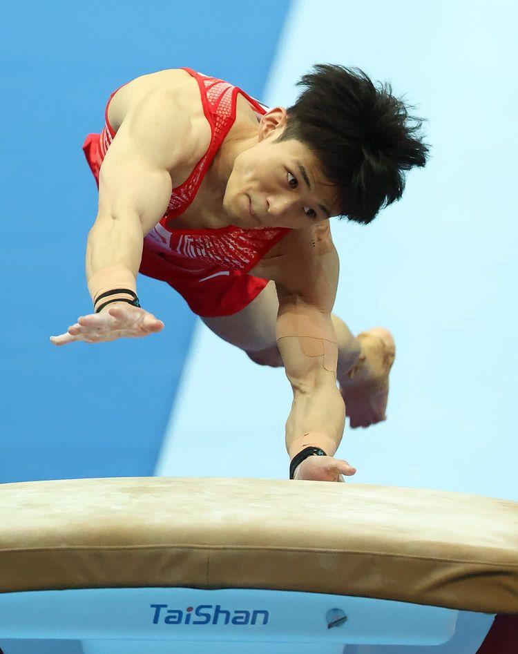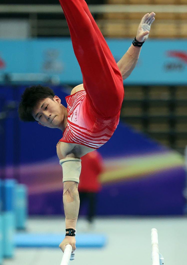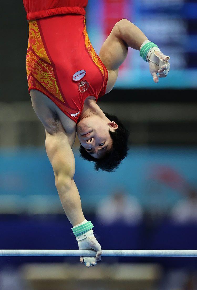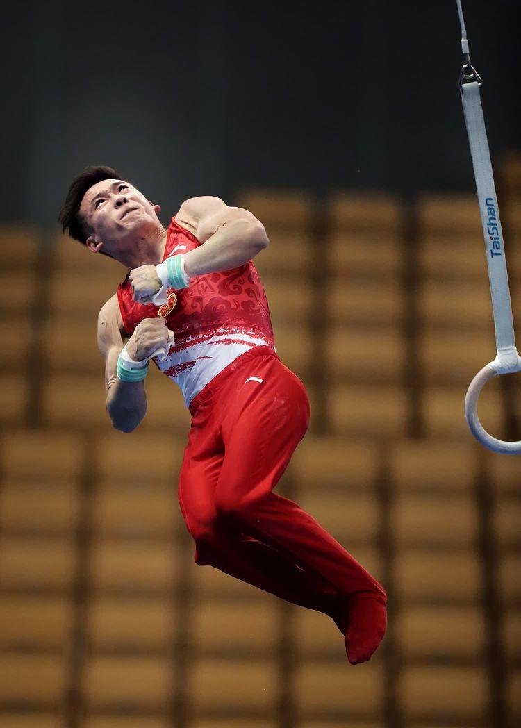 在今天的决赛中,首轮自由体操比赛张博恒就以出色的发挥得到了全场最高的14.900分。后面的比赛中他更是一骑绝尘,最终以鞍马14.000分、吊环14.600分、跳马14.800分、双杠15.150分、单杠14.700分的成绩稳居第一。其中,自由体操、双杠与单杠项目均是全场最高分,最终如愿收获了男子个人全能冠军。(图一、三、四为张博恒在争夺个人全能冠军)