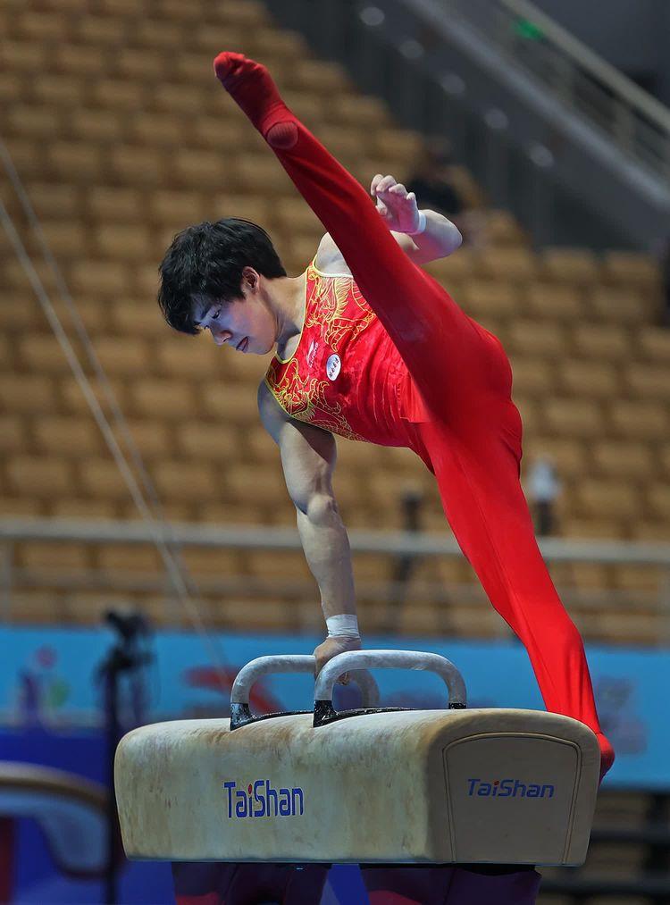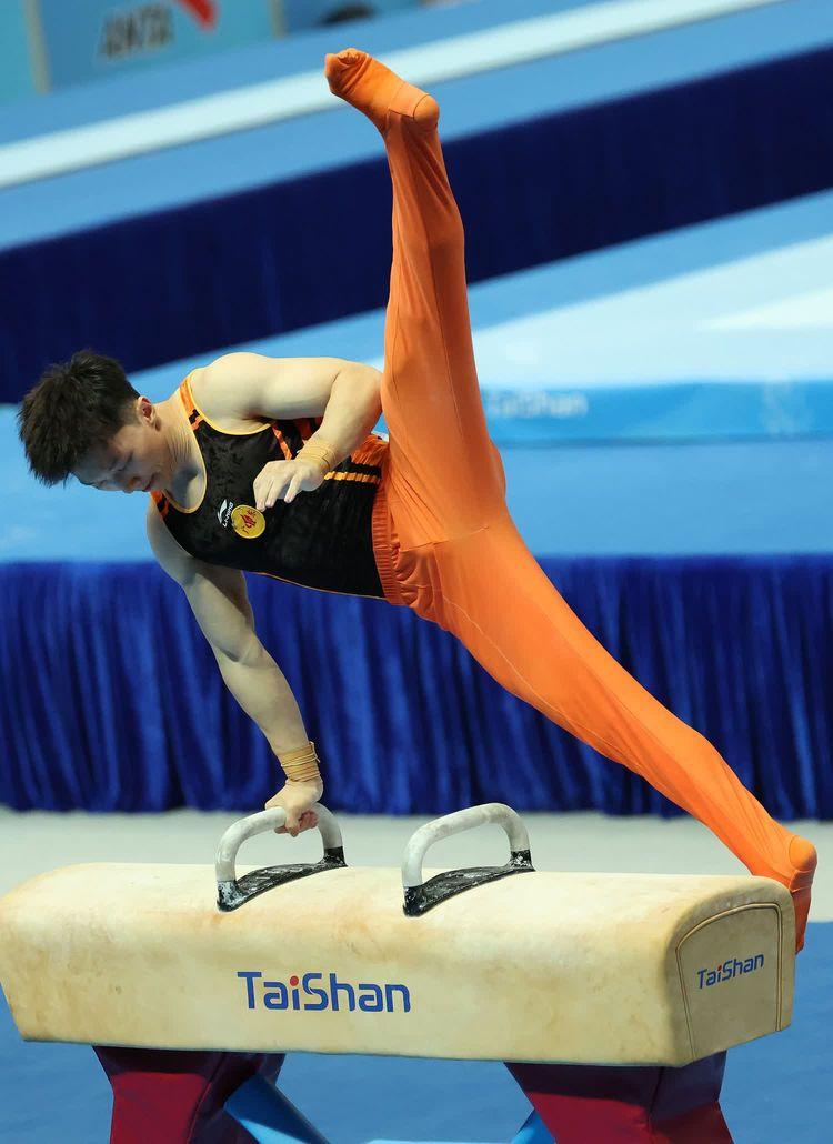 实力强大的江苏队,有侍聪、尹德行、孙炜三名选手晋级决赛。其中2001年出生的小将侍聪,肩负着国家队巴黎奥运周期男子个人全能的希望。男团决赛时他意外拉伤了手臂,这也影响到了今天比赛。接连在鞍马、双杠时出现了失误,最终收获一枚银牌。(上图为江苏队全能主力侍聪在鞍马决赛中)