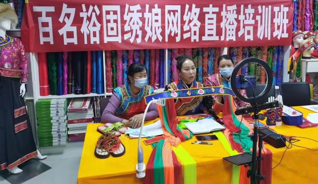 潘小红(中)通过网络直播帮助更多人学习刺绣技巧。新华社发 (佘万青摄)