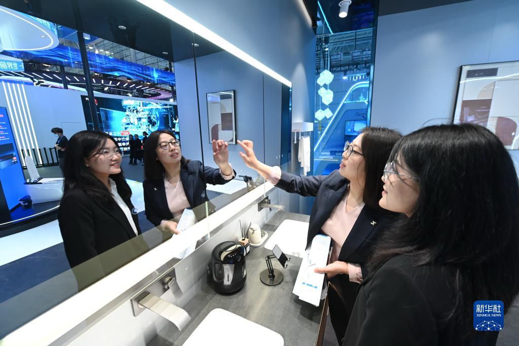 2023年4月26日,参观者体验支持鸿蒙智联的九牧卫浴智能产品。新华社记者 林善传 摄